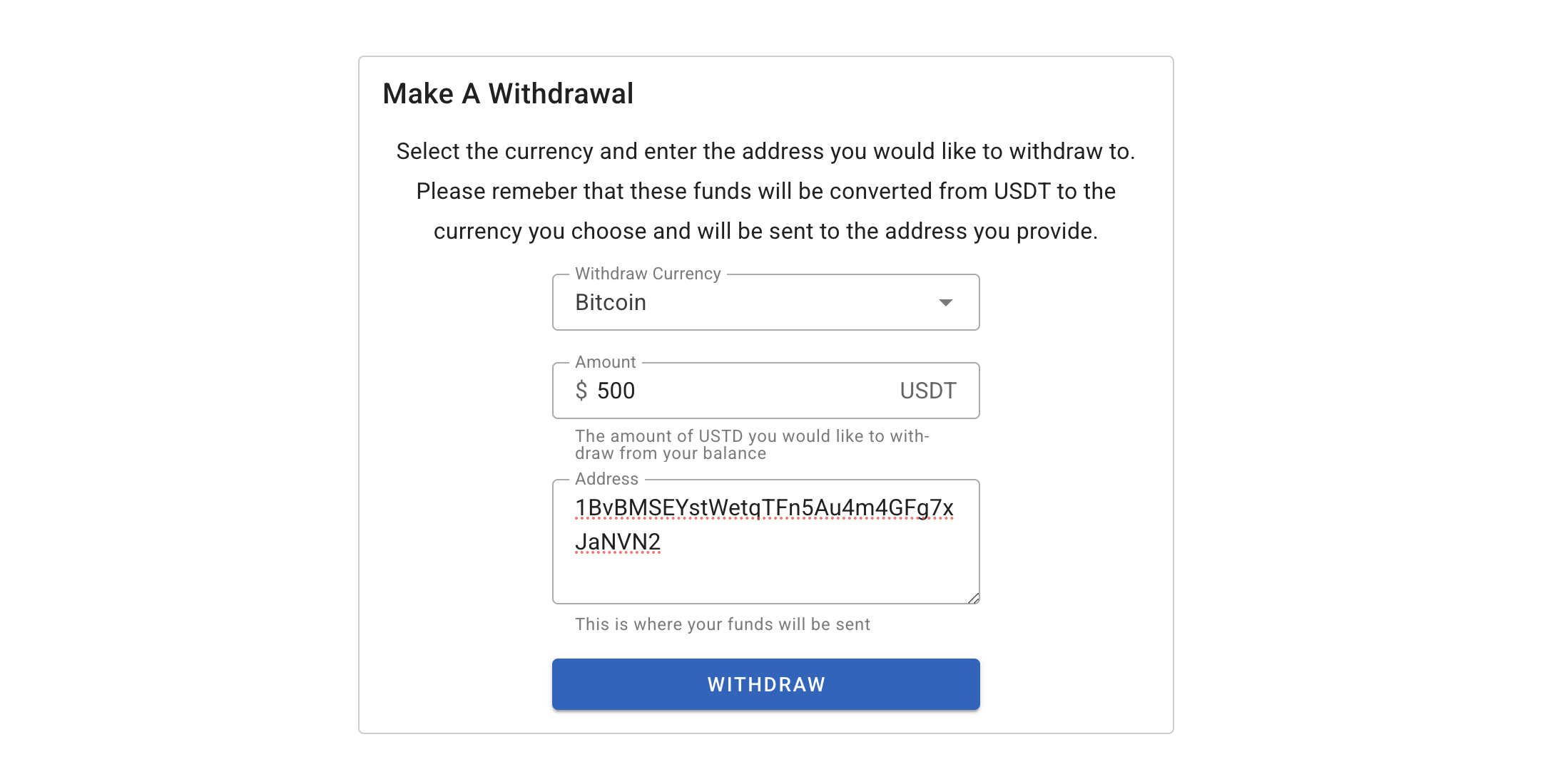 Select the currency, the amount you would like to withdraw and the address you would like the funds withdrawn to.